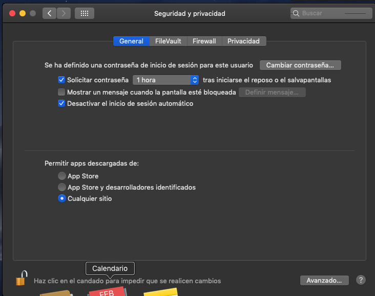 4)Ahora no dirigimos a Ajustes > Seguridad y Privacidad, activamos Permitir aplicaciones descargadas de: Cualquier sitio