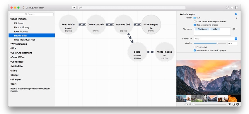 Retrobatch 1.3.1 es un procesador de imágenes por lotes flexible. Basado en nodos que pueden mezclar y combinar diferentes operaciones para crear el flujo de trabajo perfecto. Convierte archivos PSD a HEIC, JPEG, PDF, PNG o TIFF